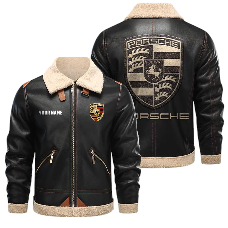 Porsche PU Leather Fleece Lining Bomber Jacket Winter Coat Custom Name