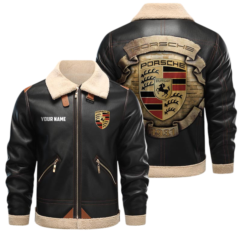 Porsche PU Leather Fleece Lining Bomber Jacket Winter Coat Custom Text