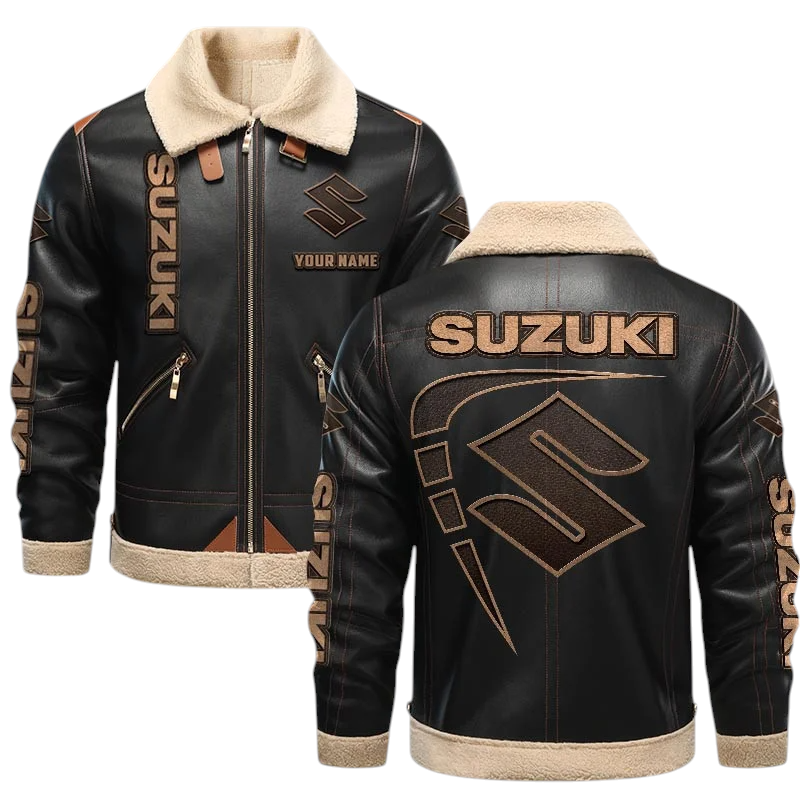 Suzuki PU Leather Fleece Lining Bomber Jacket Winter Coat Custom Text